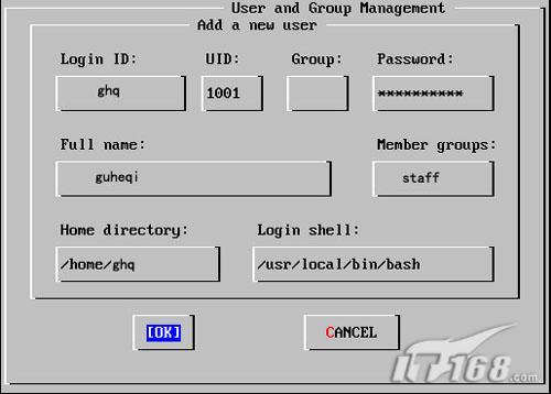 Login ID: 新用户的登陆名(强制性必须写); UID:这个用户的ID编号(如果不写,系统自动添加); Group:这个用户的登陆组名(如果不写,系统自动添加); Password:这个用户的密码(键入这个需要很仔细); Full name:用户的全名(解释、备注); Member groups:这个用户所在的组; Home directory:用户的主目录(如果不写,系统自动添加); Login shell:用户登陆的shell(默认是/bin/sh)。