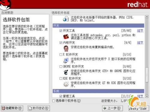 本文中的例程除引用的以外皆由笔者亲自调试通过,主要基于的内核版本为Linux 2.4,例子要在其他内核上运行只需要做少量的修改。 构建本文例程运行平台的一个较好方法是:在Windows平台上安装VMWare虚拟机,并在VMWare虚拟机上安装Red Hat。注意安装的过程中应该选中"开发工具"和"内核开发"二项(如果本文的例程要在特定的嵌入式系统中运行,还应安装相应的交叉编译器,并包含相应的 Linux源代码),如下图:
