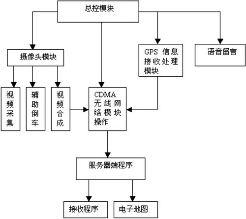 本系统车载终端硬件部分主要包括X-Hyper Xscale PXA255B开发板,液晶屏,GPS接收板,USB摄像头、CDMA通信模块等。软件模块主要包括GPS接收模块、语音留言模块、视频取证与辅助倒车模块、无线监控模块,并设计有统一的图形用户界面。