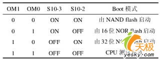 S3C2410A支持从GCS0上的NOR FLASH启动(16位或32位)或从NAND FLASH启动,需要通过OM0和OM1上电时的上下拉来设置:
